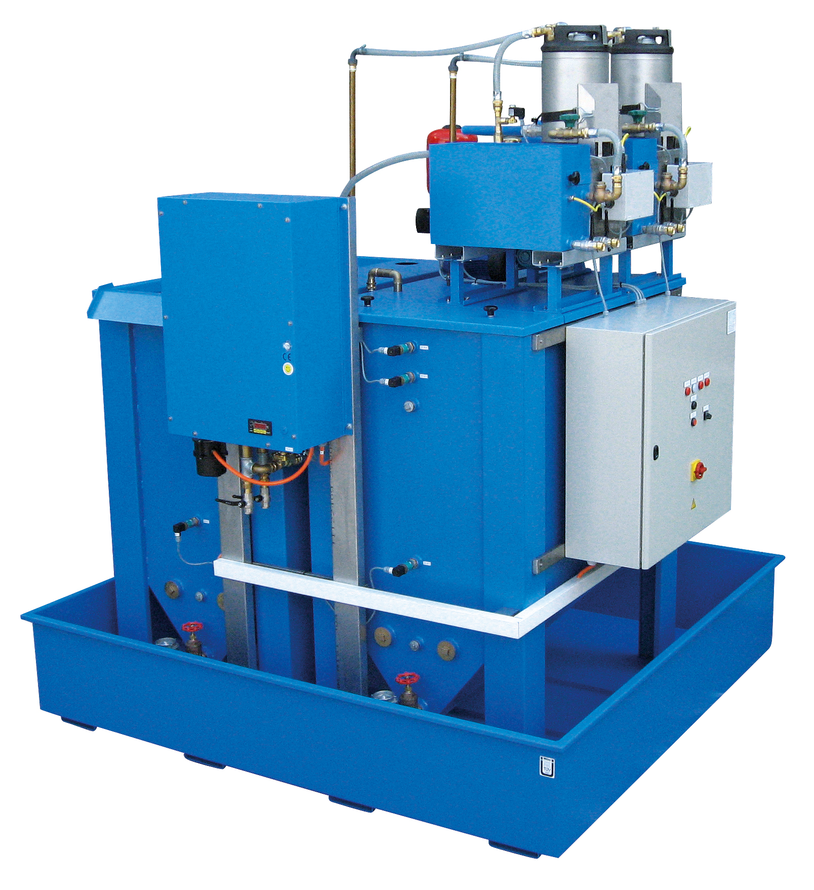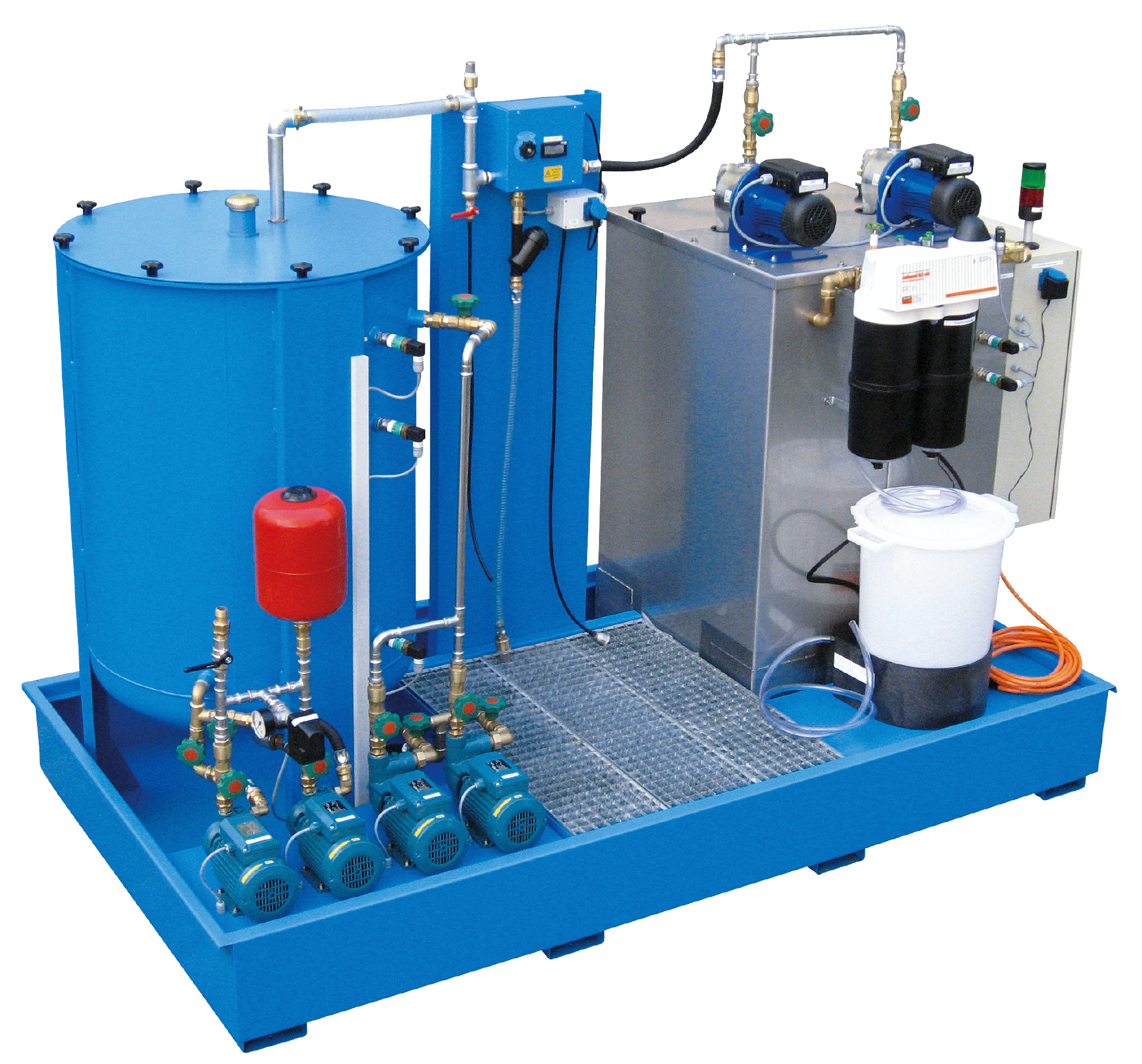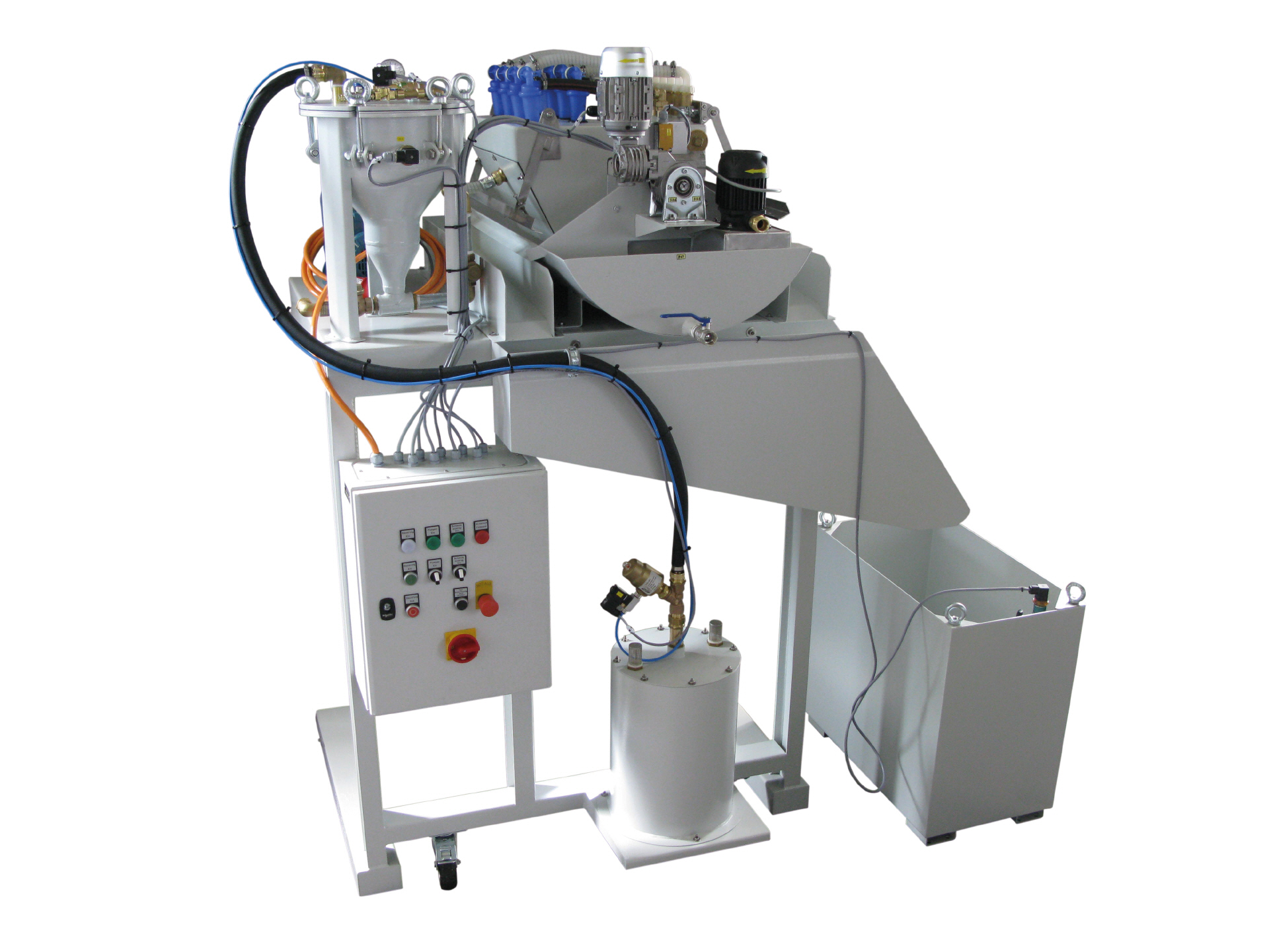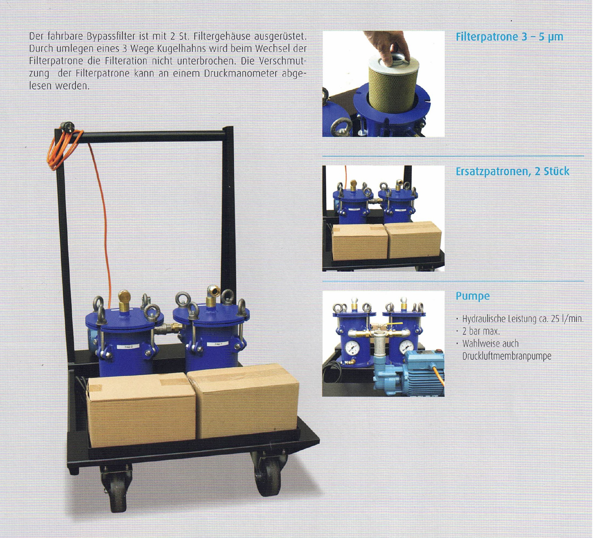Der fahrbare Bypass-Filter ist mit zwei Filtergehäusen ausgerüstet. Durch umlegen eines 3-Wege-Kugelhahnes wird beim Wechsel der Filterpatrone die Filtration nicht unterbrochen. Die Verschmutzung der Filterpatrone kann an einem Druckmanometer abgelesen werden. |