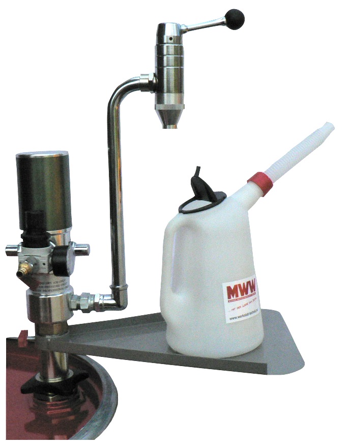 Halbautomatische Fasspumpe. Über ein Druckluftanschluss und betätigen des Zapfhahnes, fördert die Fasspumpe automatisch so lange wie der Hebel gehalten wird. Für Motor-, Getriebe-, Hydraulik- und Dieselöle. Über den Druckregler mit Manometer stellt man, entsprechend der Viskosität des Öles, einen gleichmäßigen Zapfstrahl ein. Das angebaute Ablageblech dient zum Abstellen des Messgefäßes während des Zapfens. Lieferung ohne Messkanne Art. 200801 |