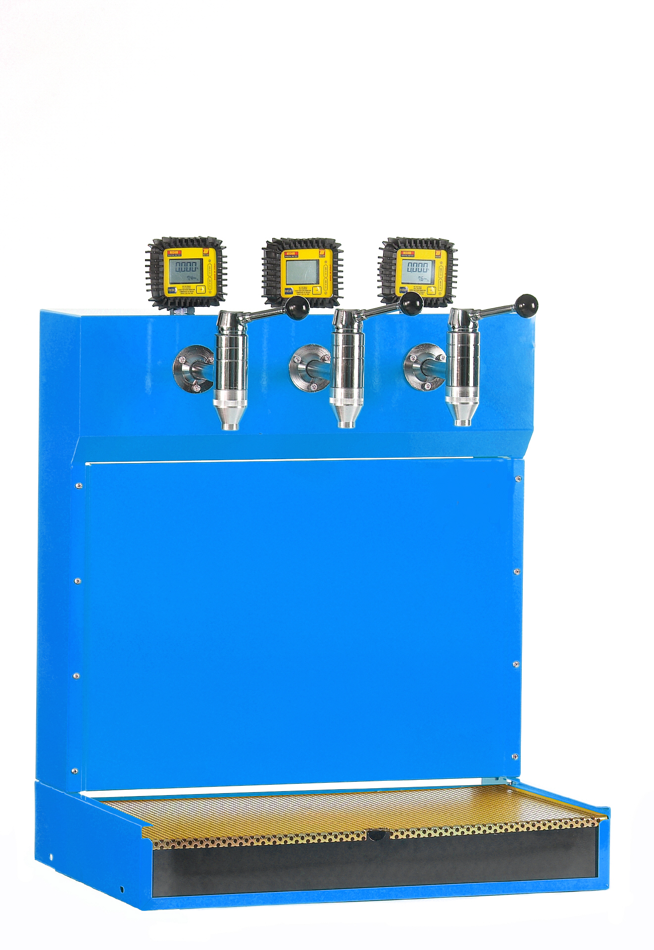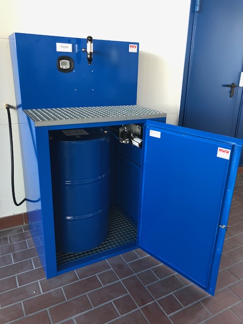 Ölbar zum Abstellen des Messbechers oder Ölkanne auf Abstellgitter und Öltropfwanne beim Zapfen, gleichzeitig mit Unterschrank zum Aufbewahren des Ölfasses bis max. 200 Liter. Optional mit digitalem Zähler oder Mengenvorwahl zum genauen Abfüllen. Abb. mit pneumatischer Pumpe |